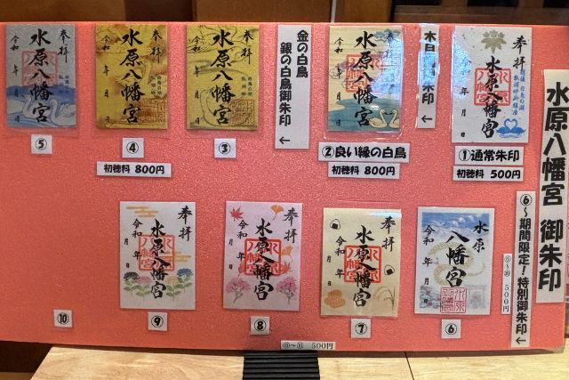 - 御朱印は基本のものから正月限定・季節限定があり、瓢湖の白鳥やその年・その季節でさまざまなものを題材にしており、いつ訪れても楽しむことができます。